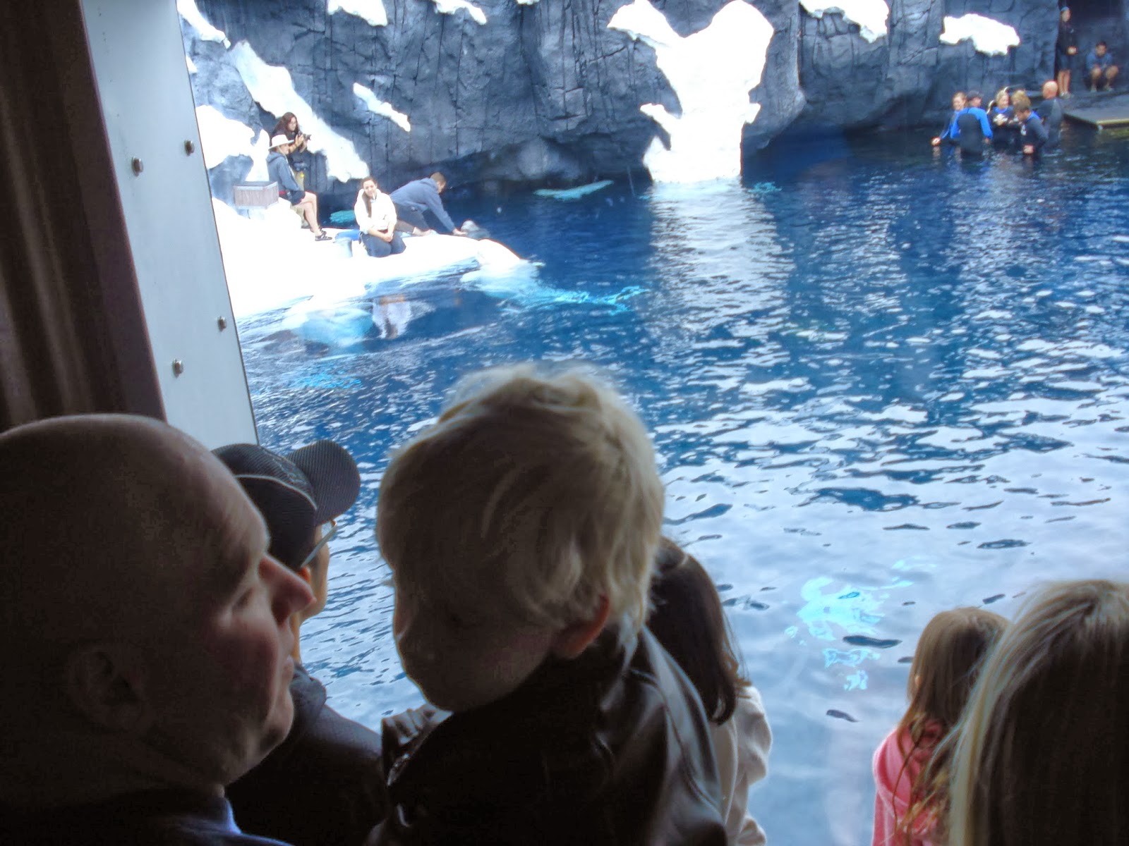 One in particular had figured out that if he gets on the rock he is taller than the rest. Since they can hold their breath under water for a long time......that means they can also make that barking sound continuously. So it was loud obnoxious. I got Baby Bear a tray, and the guy selling them was a Navy vet who was working at Sea World while going to school to become a trainer. Instead of the 6 fish I paid for, he gave us a huge handful because Chuck was deploying the next day and he understood. ;0D Baby Bear wouldn't touch the fish, but liked to watch us feed them. And he really was not a fan of all the barking noise they made. It was kinda funny that he covered his ears the entire time.